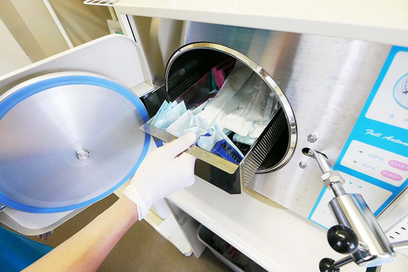 患者さまが安心して通えるように、院内感染予防に万全の対策を講じています。治療器具は使用ごとに滅菌器にて滅菌処理を行い、一つ一つをフィルム包装(滅菌パック)するため、保管中に汚れる心配もありません。