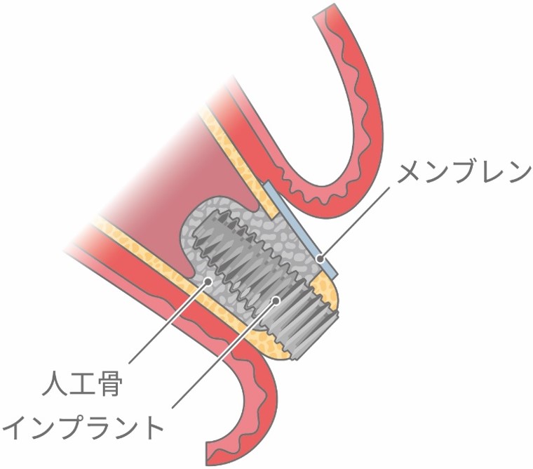 インプラントを埋め込む場所に骨が不足している場合に行います。骨補填材と遮蔽膜(メンブレン)を使用して行う骨造成法です。